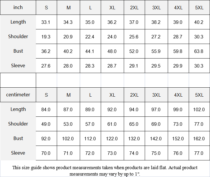 inch S M L XL 2XL 3XL 4XL 5XL
