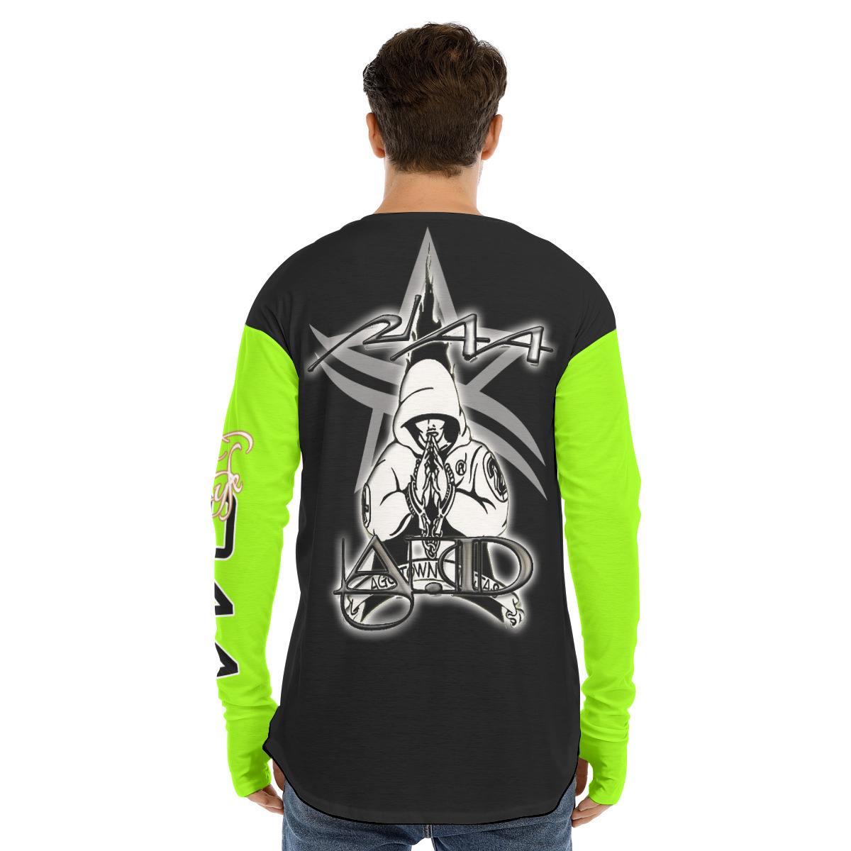 • Crew neck, long sleeve, curved hem