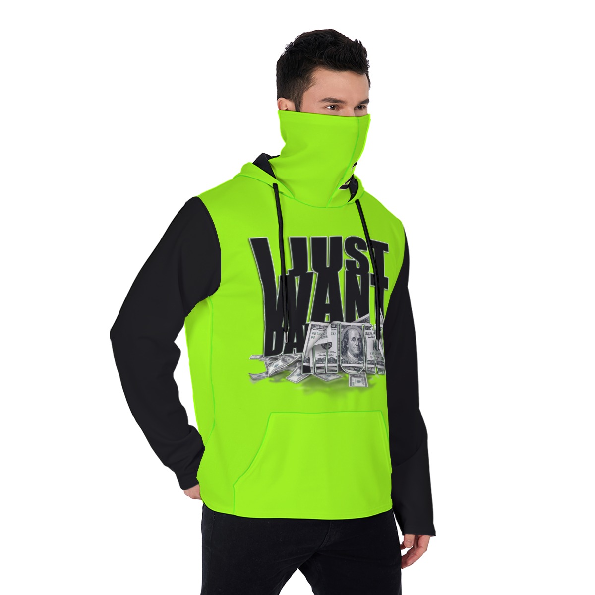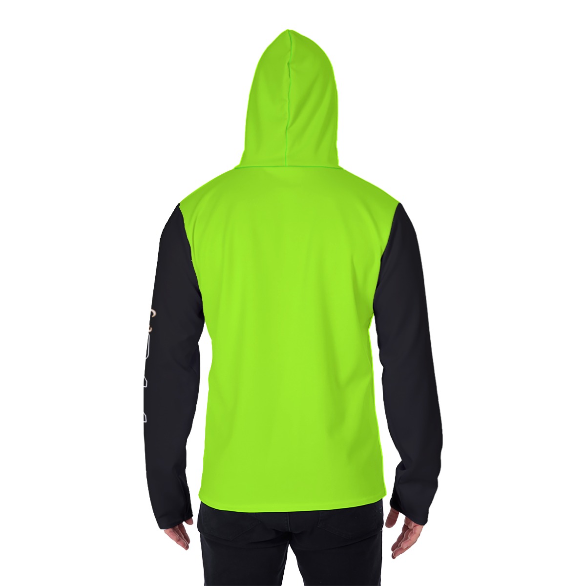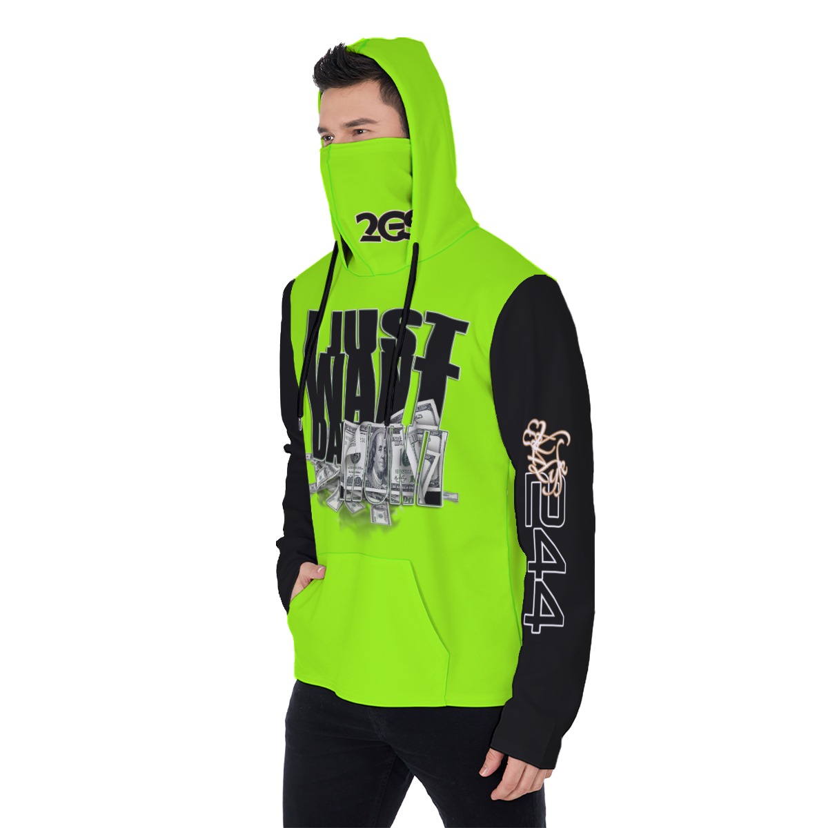 - Drawstring,mask, front pocket and black inner hood