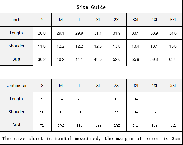 The size chart is manual measured, the margin of error is 3cm